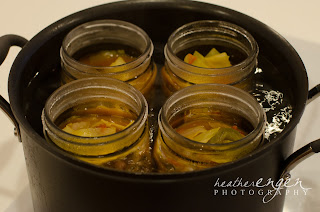 While my soup was simmering, I filled up an 8 qt pot of water. You have to figure out how much water to add to the pot of water so that when it's full of jars, the water will come up to about an inch below the top of the pot. Typically I just hold down 4 jars while I fill up the pot with water. But since I was being all fancy and taking pictures, I actually filled them with water too to keep them down in place. Once you have the right amount of water, remove the empty (or water-filled) jars and get that pot of water boiling.