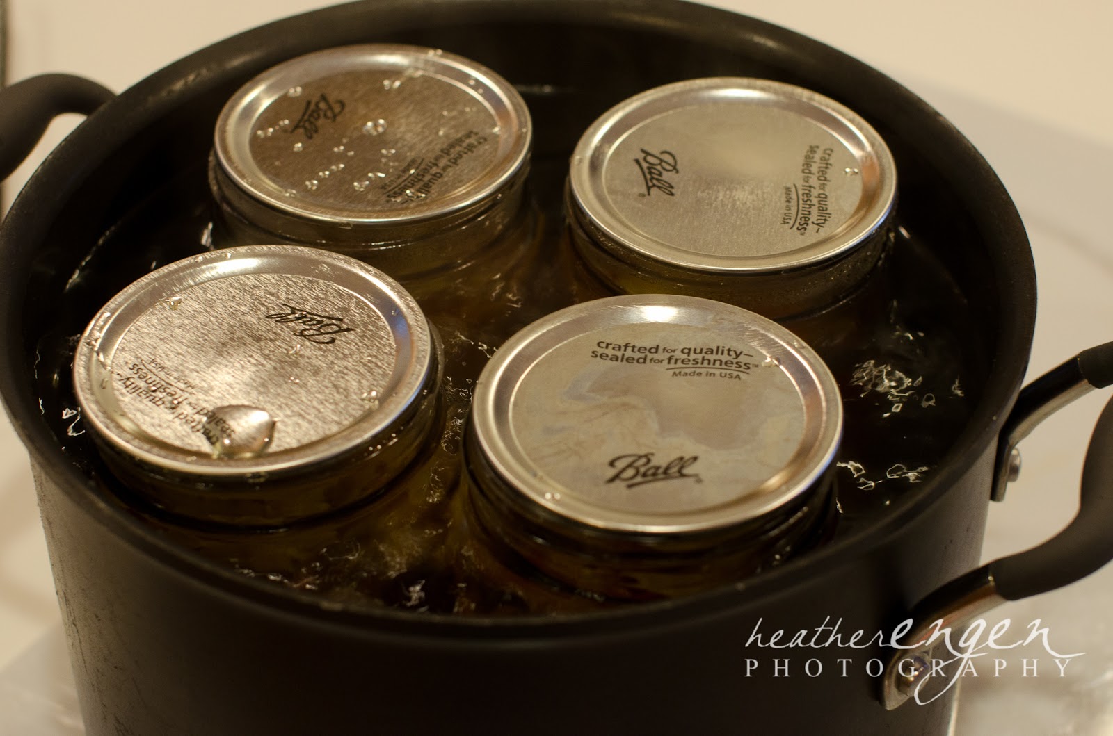 I can't remember when my brother told me to add the lids but I typically do it when the jars are still in the boiling water. I have this fancy shmancy magnetic tool to move the lids from the pot of boiling water to the jars. Once again, the wide mouth jars messed me up because these lids were bigger and therefore heavier so they didn't work too great with my little magnetic tool.