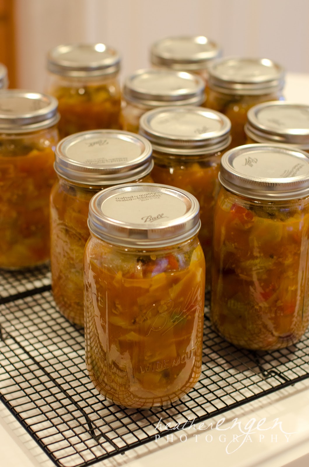 Here are the finished jars of soup. As they're cooling, you'll hear the lids pop when they seal. Once that happens, the lids won't have much give to them - if at all. These jars all had great seals so they didn't budge at all, when I pushed on them.